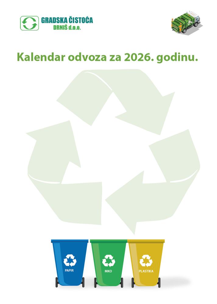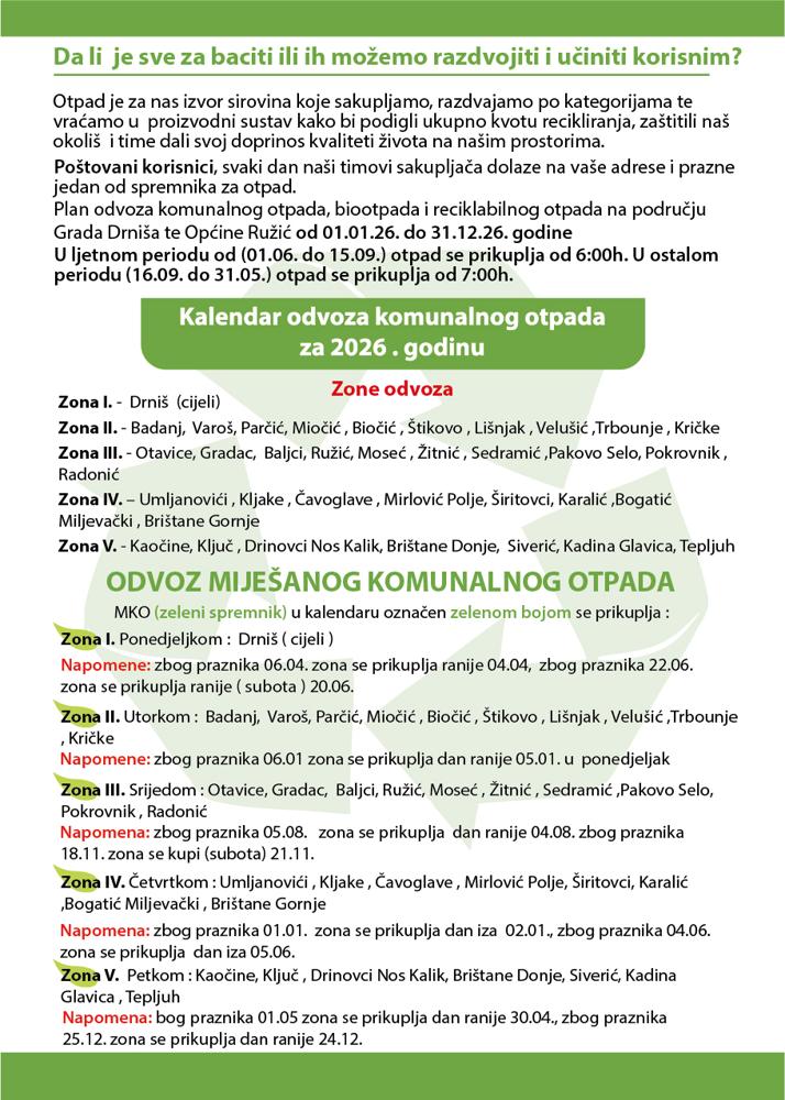 Plan odvoza komunalnog otpada, biootpada i reciklabilnog otpada na području Grada Drniša te Općine Ružić od 01.01.2026. do 31.12.2026. godine DOKUMENTI ZA PREUZIMANJE: 1. PLAN ODVOZA OTPADA ZA 2026. GODINU 223 KB PDF 12 Siječanj 2026Obavijesti
