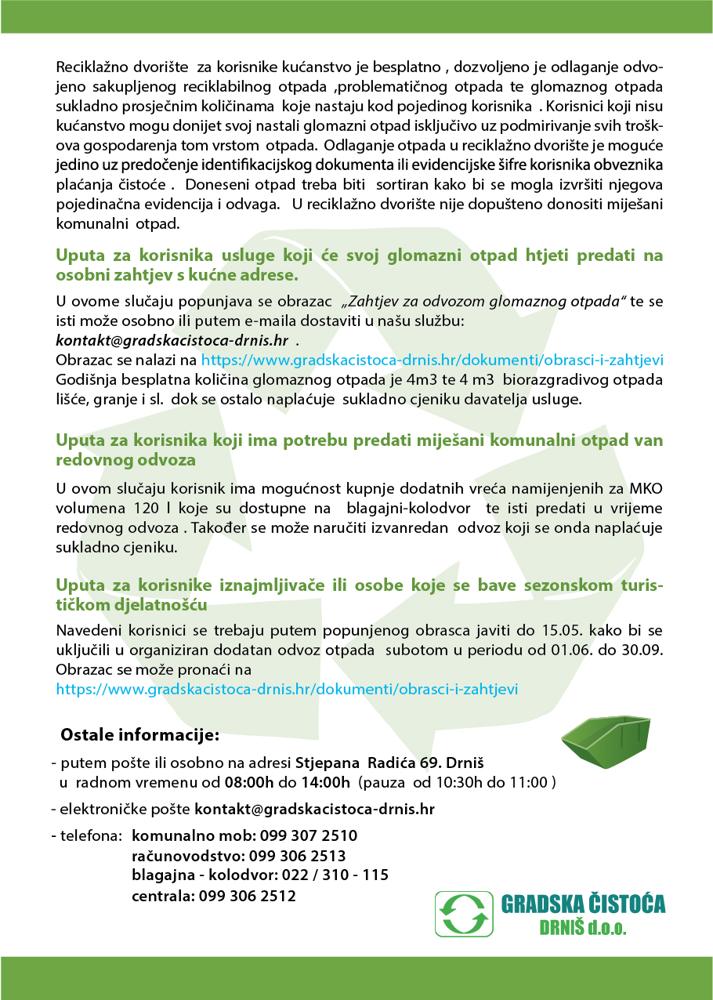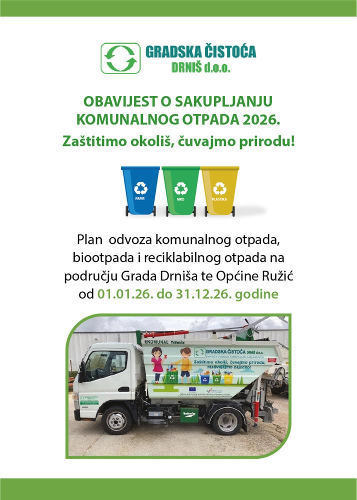 Plan odvoza komunalnog otpada, biootpada i reciklabilnog otpada na području Grada Drniša te Općine Ružić od 01.01.2026. do 31.12.2026. godine DOKUMENTI ZA PREUZIMANJE: 1. PLAN ODVOZA OTPADA ZA 2026. GODINU 223 KB PDF 12 Siječanj 2026Obavijesti